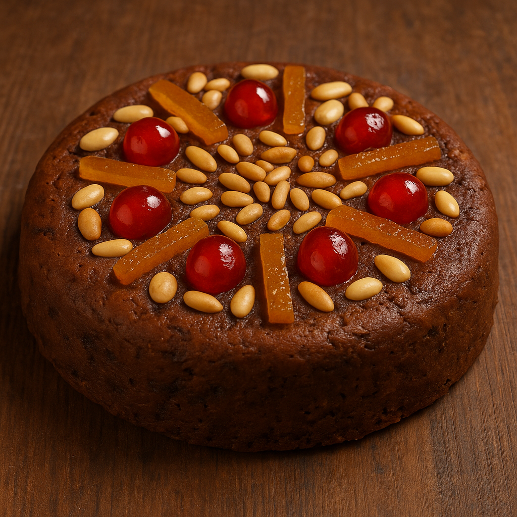 “Farina con miele e spezie, confetti di cedro, mandorle e pinoli, cotto al forno in forma tonda. Si conserva molti dì e migliora col tempo.”