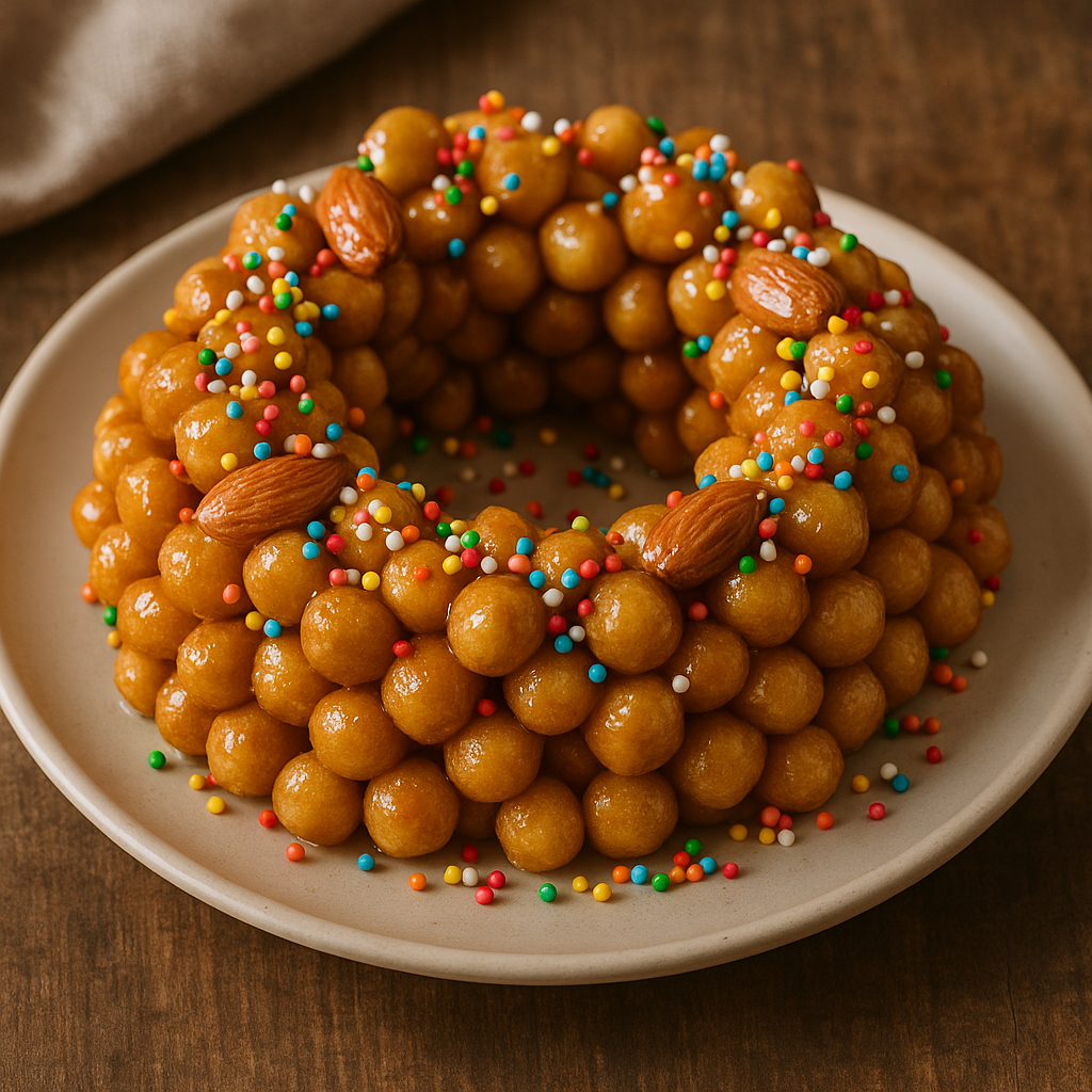 📖 Descrizione storicaLa Cicerchiata è un dolce tipico del Carnevale umbro, molto diffuso anche nelle Marche e in Abruzzo. Il nome deriva dai “cicerchi” (ceci), cui le piccole palline di pasta fritte assomigliano. È composta da bocconcini di impasto fritti, uniti con miele caldo e arricchiti con mandorle e decorazioni colorate. Un dolce festoso, simbolo di abbondanza e allegria, che si prepara tradizionalmente in famiglia nei giorni che precedono la Quaresima.