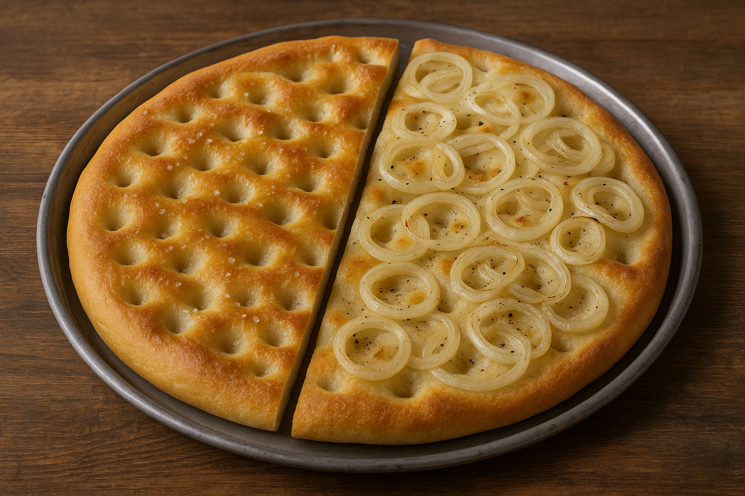 📝 DescrizioneLa focaccia genovese (in dialetto fugassa) è una delle specialità più famose della Liguria e vanto della cucina genovese. Soffice, alta circa 2 cm e lucida d’olio, si distingue per la tipica salamoia di acqua, olio e sale grosso che crea i caratteristici “buchi” sulla superficie. Può essere gustata semplice oppure arricchita con cipolle affettate sottili. È uno degli street food più amati in Italia, perfetta a colazione, come spuntino o come aperitivo.
