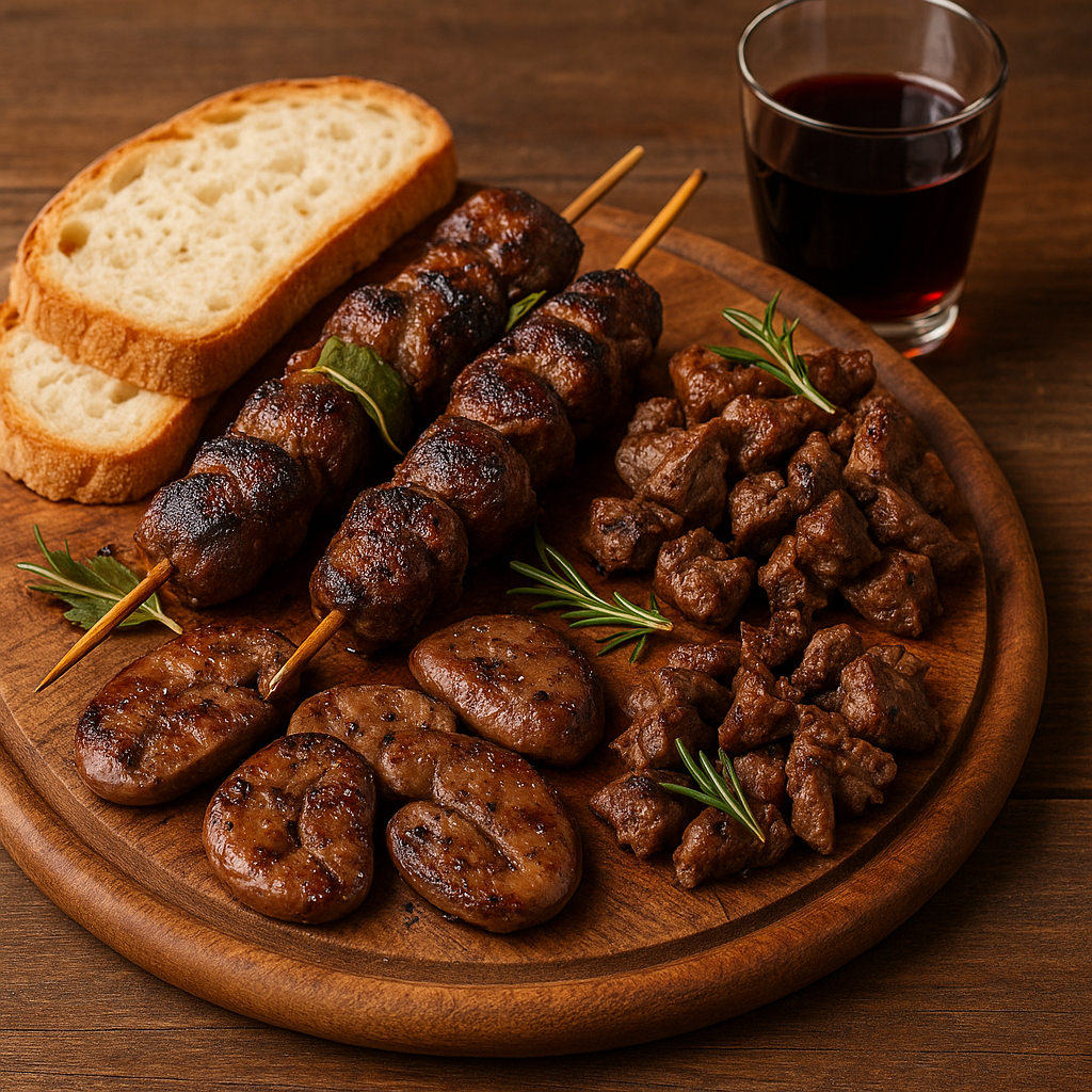 - Cottura: arrostire tutto sulla brace viva o griglia ben calda, girando spesso, per circa 15–20 minuti (i rognoni leggermente meno).