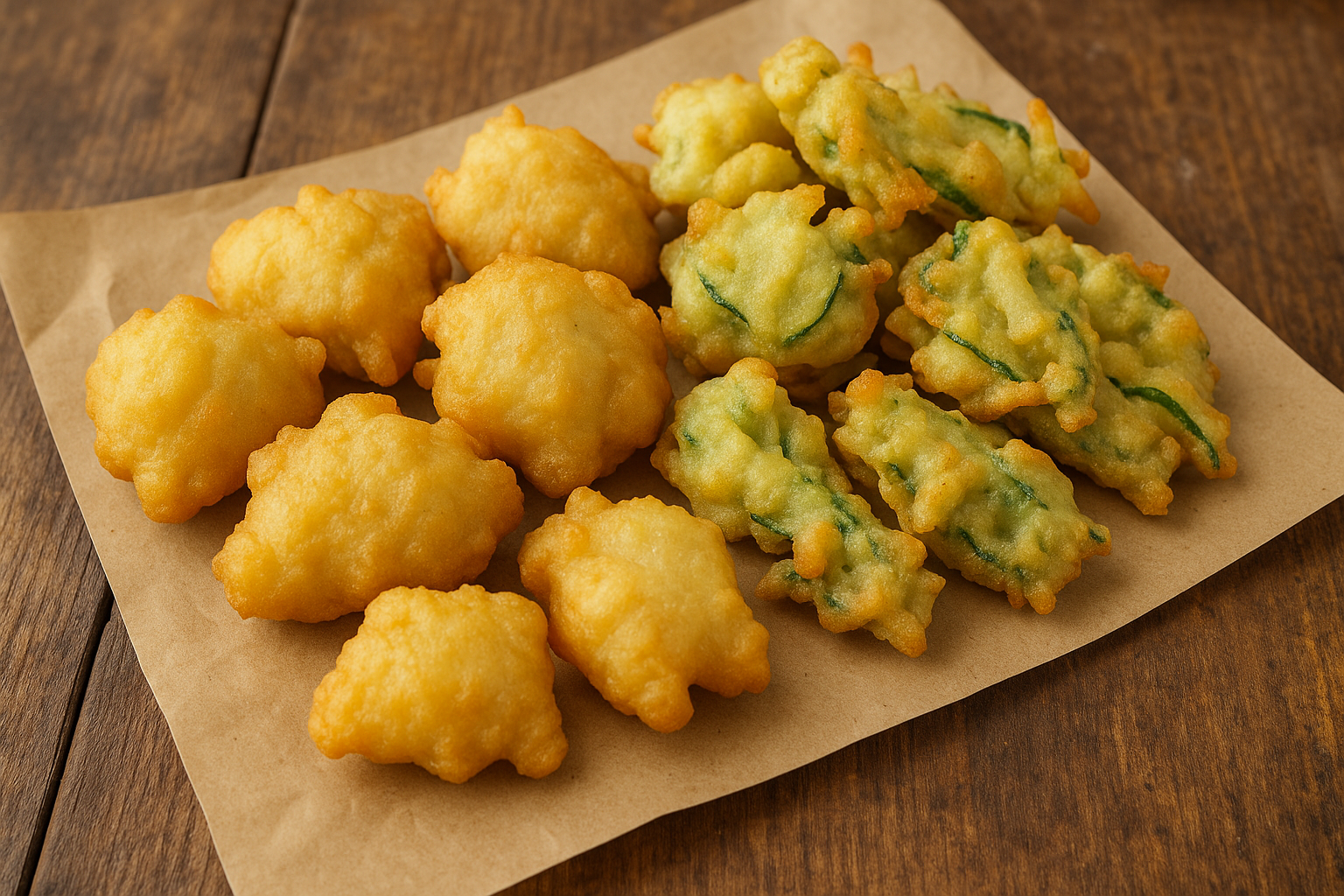 Realizzate con una pastella leggera a base di farina, acqua frizzante e lievito, vengono arricchite con pezzetti di baccalà già ammollato oppure con verdure di stagione, quindi fritte al momento in abbondante olio caldo.