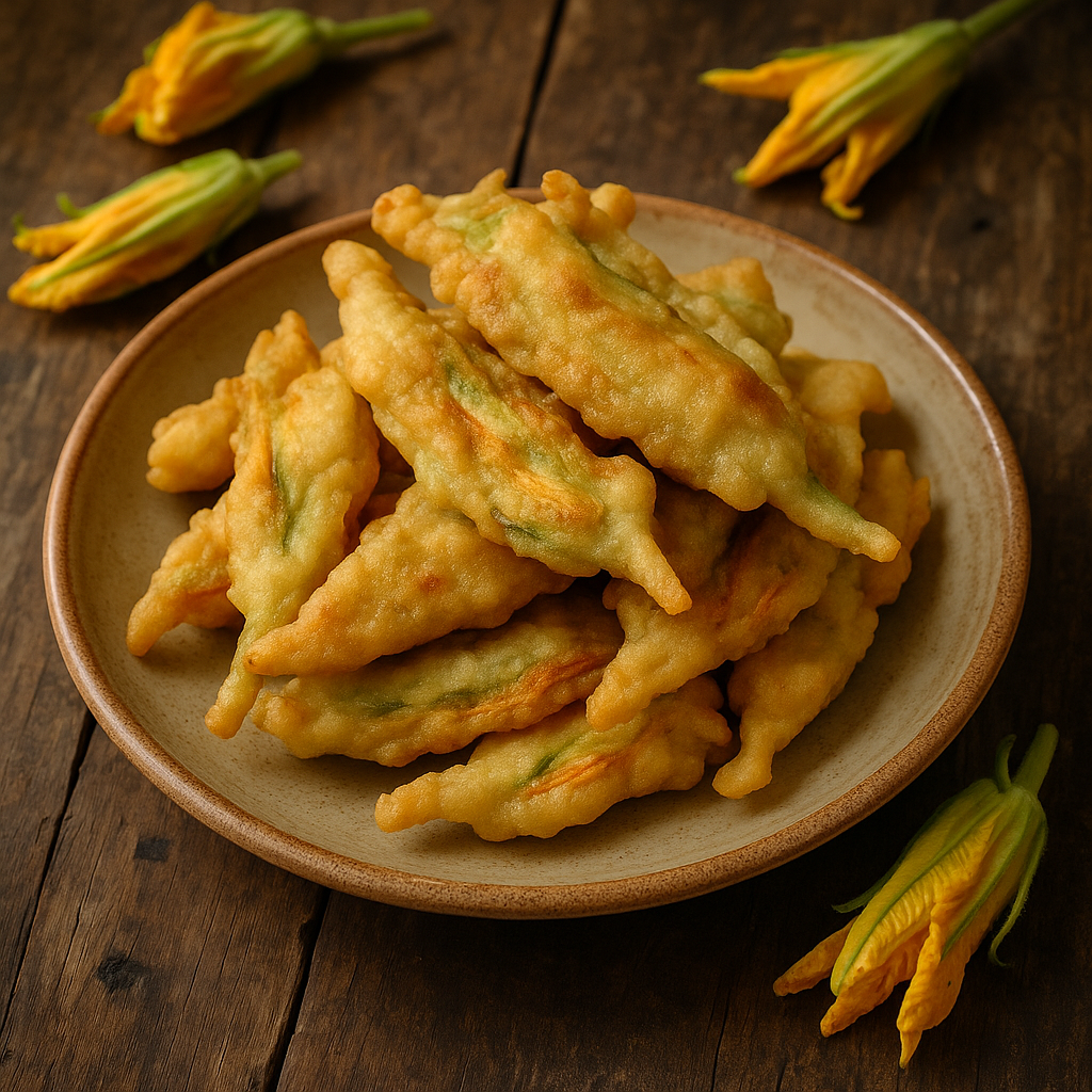 Le frittelle di fiori di zucca sono una specialità della tradizione contadina italiana, molto diffusa anche in Umbria. I fiori, raccolti freschi in estate, venivano immersi in una pastella semplice a base di farina e acqua, poi fritti nell’olio, diventando un piatto povero ma saporito. Con il tempo, la ricetta è stata arricchita con formaggi locali come il pecorino, erbe aromatiche o acciughe. Oggi restano uno degli antipasti più amati nelle sagre e nelle cucine familiari, simbolo di convivialità e genuinità.