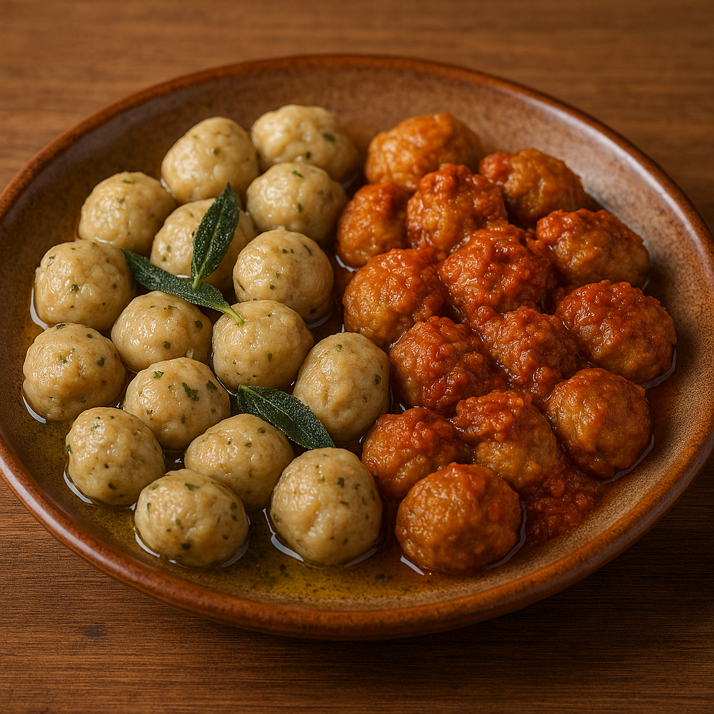 Gli gnocchi di pane sono un piatto di recupero nato per riutilizzare il pane raffermo. Vengono preparati con pane ammollato nel latte e uova, arricchiti con formaggio, erbe aromatiche o spinaci, e modellati in piccoli gnocchi da cuocere in acqua bollente. Hanno consistenza morbida e sapore delicato. Si condiscono solitamente con burro fuso e salvia, oppure con ragù di carne.