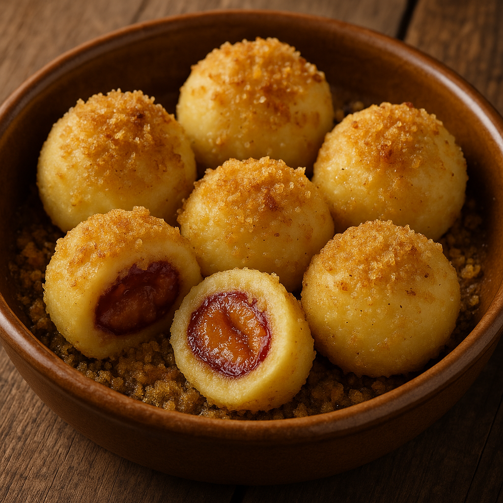 Gli Gnocchi di susine (gnocchi di prugne) sono grandi gnocchi di patate ripieni di susine intere o di metĂ  frutto, spesso con lo zucchero al centro, cotti in acqua e conditi con burro fuso e pangrattato zuccherato. Sono un piatto che unisce il dolce e il salato in un equilibrio perfetto: la morbidezza della pasta di patate avvolge la succosa freschezza della susina, mentre il condimento finale li rende irresistibili. Possono essere serviti come dessert, ma nella tradizione contadina spesso rappresentavano un piatto unico o il piatto della festa.