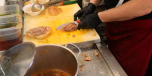 - Servizio street food: tagliare un panino a metà, inzuppare la mollica nel brodo, farcirlo con lampredotto e condire con salsa verde o piccante.