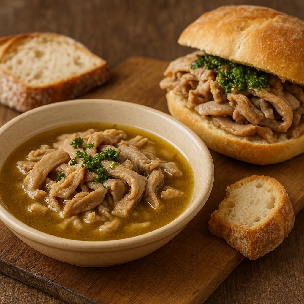 Il lampredotto è una delle frattaglie bovine più apprezzate a Firenze: si tratta della quarta stomaco del bovino (l’abomaso), cucinato a lungo in un brodo aromatico con verdure, pomodoro e spezie. Viene servito sia come piatto caldo al piatto, sia – e soprattutto – nel tipico panino col lampredotto, condito con salsa verde e/o salsa piccante, vera istituzione dello street food fiorentino.