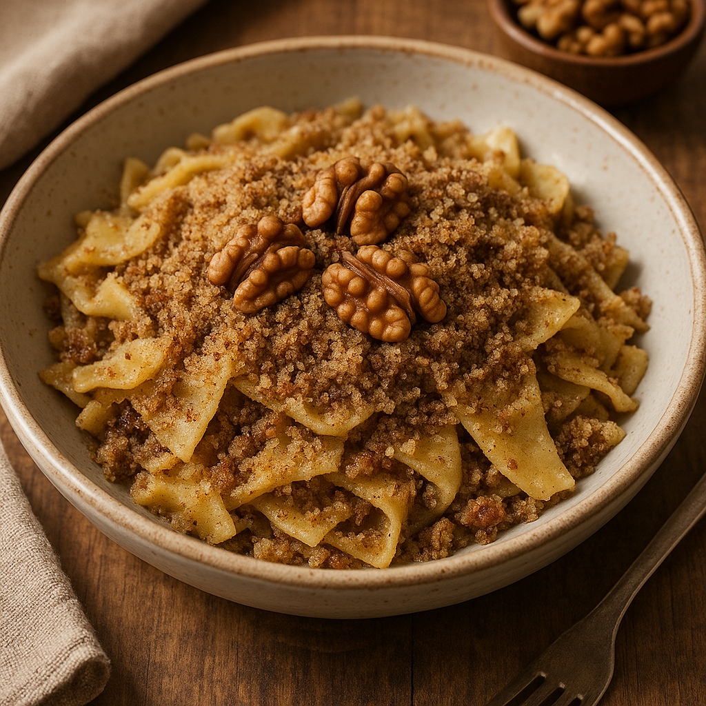 I Maccheroni con le noci sono un dolce tradizionale umbro, diffuso soprattutto nel periodo natalizio e nelle feste di paese. Nonostante il nome, non si tratta di un piatto salato ma di un dessert povero della tradizione contadina. Viene preparato con pasta fresca fatta in casa (spesso maltagliati o strangozzi), condita con un composto a base di noci tritate, pane grattugiato, zucchero, cacao, cannella e un tocco di liquore. È un piatto simbolo di convivialità, nato dalla capacità di trasformare ingredienti semplici in una pietanza ricca e festosa.