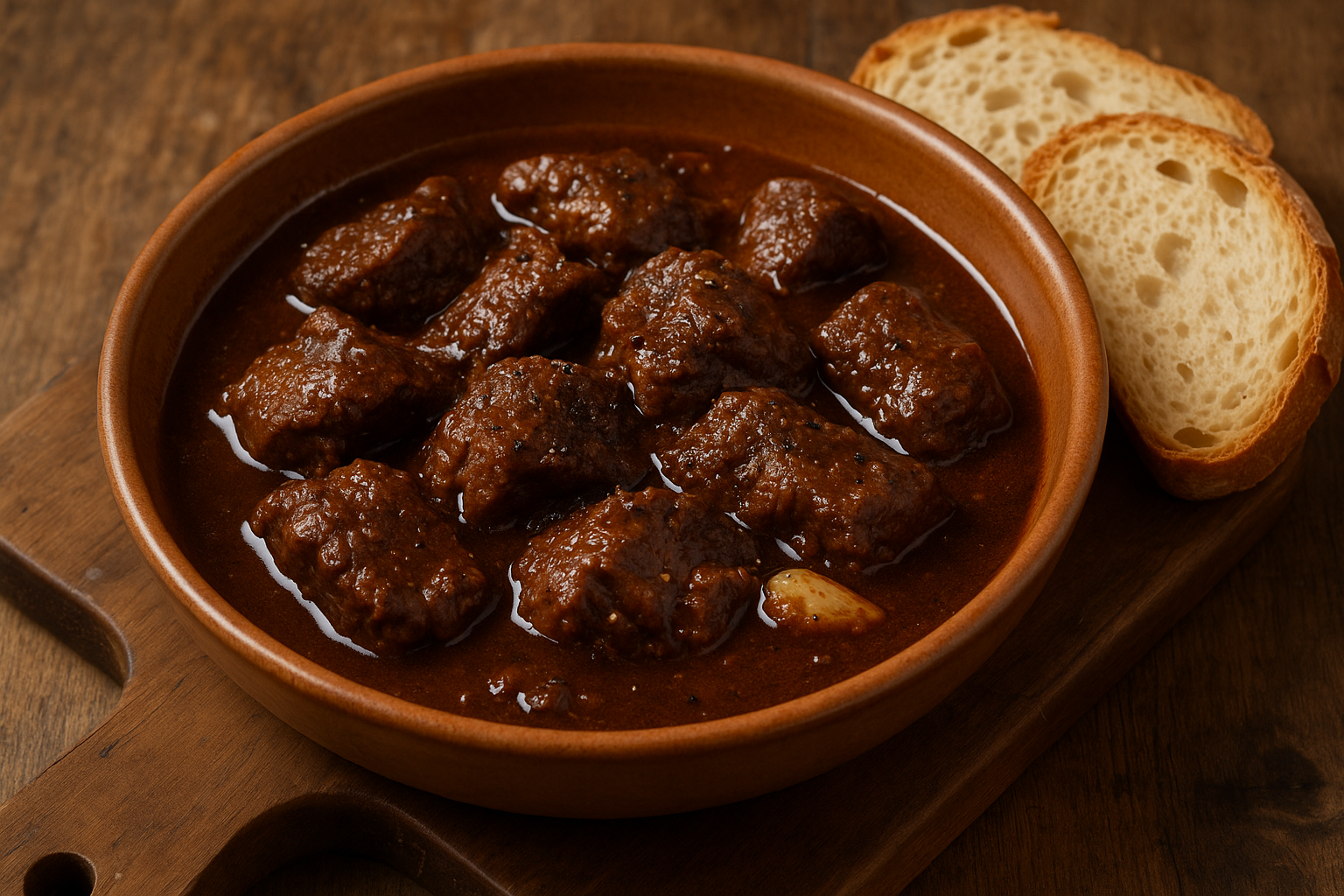 “Si pongano pezzi di manzo in pignatta con assai pepe nero, spicchi d’aglio e vino rosso di Chianti. Si lasci cuocere a foco lento per molte ore, sinché la carne sia tenera e il sugo ristretto.”