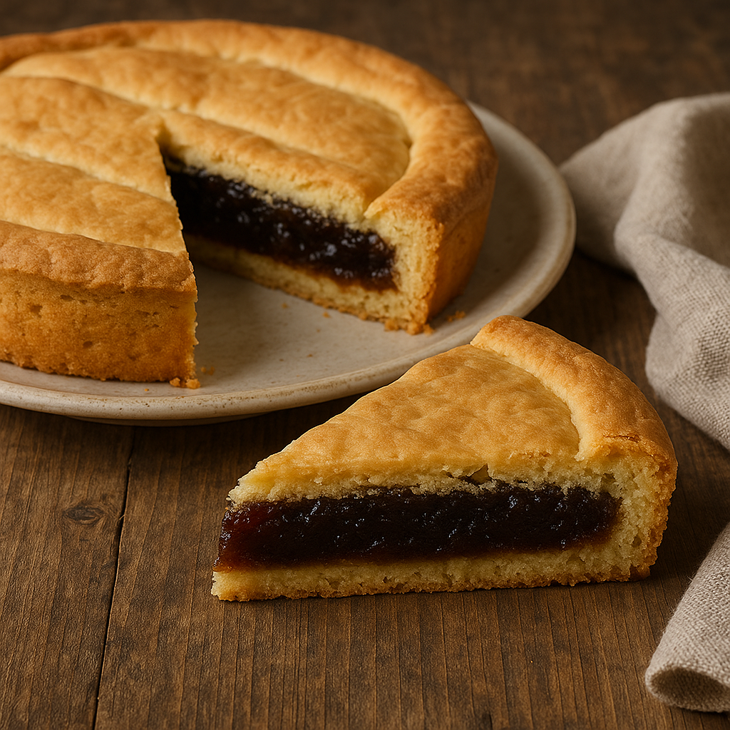 “Con farina, zucchero, burro e uova si fa pasta tenera, la quale si riempie di mostarda di cotogne, e si cuoce in forno. Si conserva molti dì, e sempre più buona riesce.”