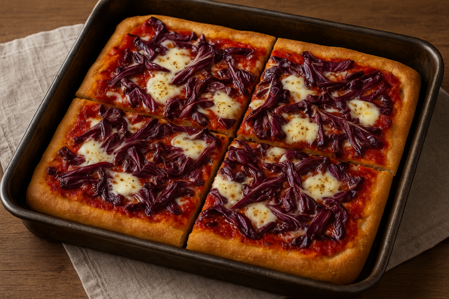 La pizza al taglio veneta è una preparazione tipica delle panetterie e pizzerie del Veneto, caratterizzata da un impasto alto, soffice e leggermente croccante alla base, cotto in teglia e servito a pezzi rettangolari.A differenza della classica pizza napoletana, questa versione è più simile a una focaccia condita, spesso proposta con ingredienti locali e stagionali: sopressa veneta, radicchio di Treviso, asiago, cipolla bianca, zucchine o semplicemente pomodoro e mozzarella.