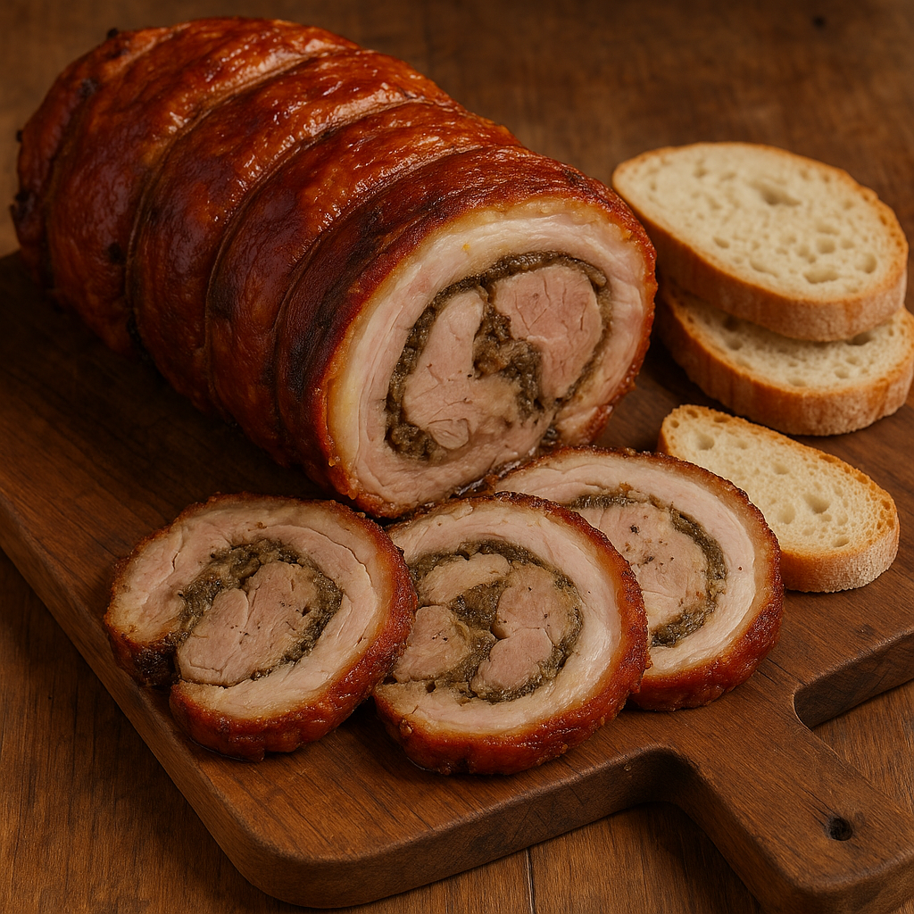 La porchetta umbra è uno dei piatti più iconici della tradizione culinaria regionale. Si tratta di un maiale intero disossato e condito con finocchio selvatico, aglio e pepe 🌿🧄, quindi arrostito lentamente in forno o su brace fino a ottenere una carne morbida e succosa all’interno e una cotenna croccante e dorata. Le sue origini risalgono all’epoca romana, quando la carne di maiale veniva speziata e cotta a lungo per essere conservata e gustata durante i banchetti. In Umbria la porchetta è diventata regina delle feste popolari e delle sagre, venduta a fette o in panini imbottiti 🍞.