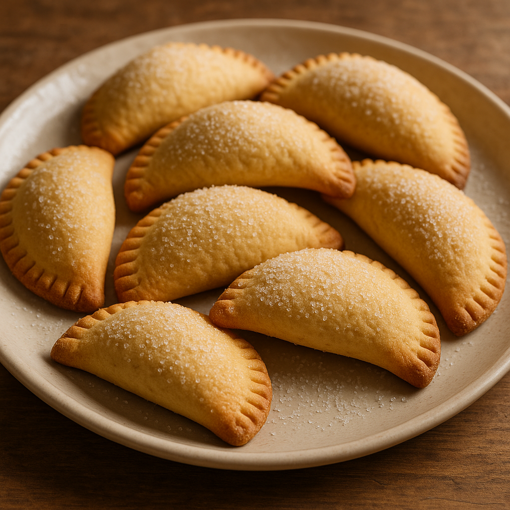 “Prendesi farina fine e zucchero con ova e butiro, se ne fa pasta tenera, e si distende col mattarello. Si empiono con mostarda di prugne o di pere cotogne, si piegano in forma di raviolo, si cuociono al forno, e si servono con zucchero sopra.”