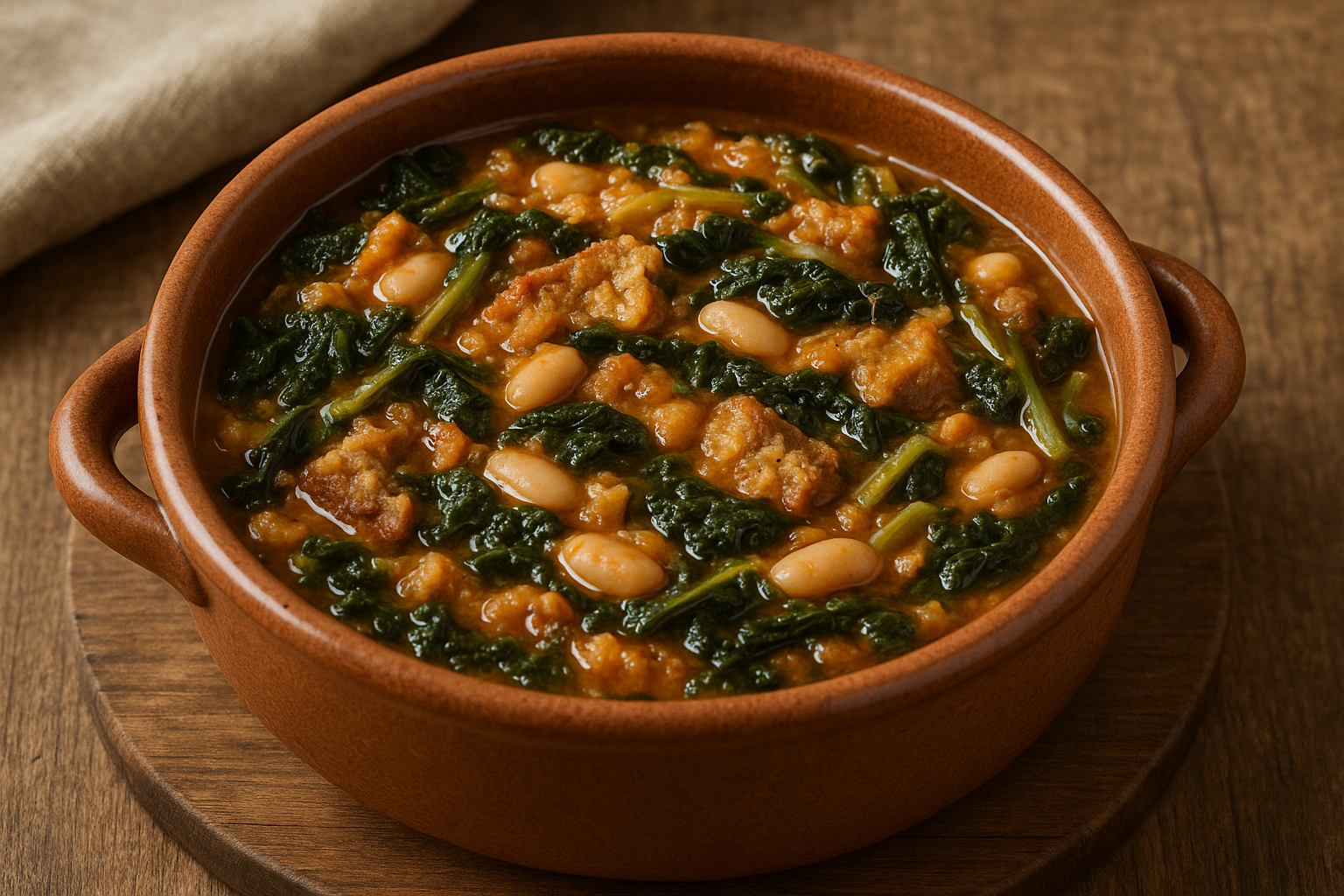 9. Verdure: unire cavolo nero, verza, bietole e patate a dadini. Coprire con acqua o brodo e cuocere 40–50 minuti.