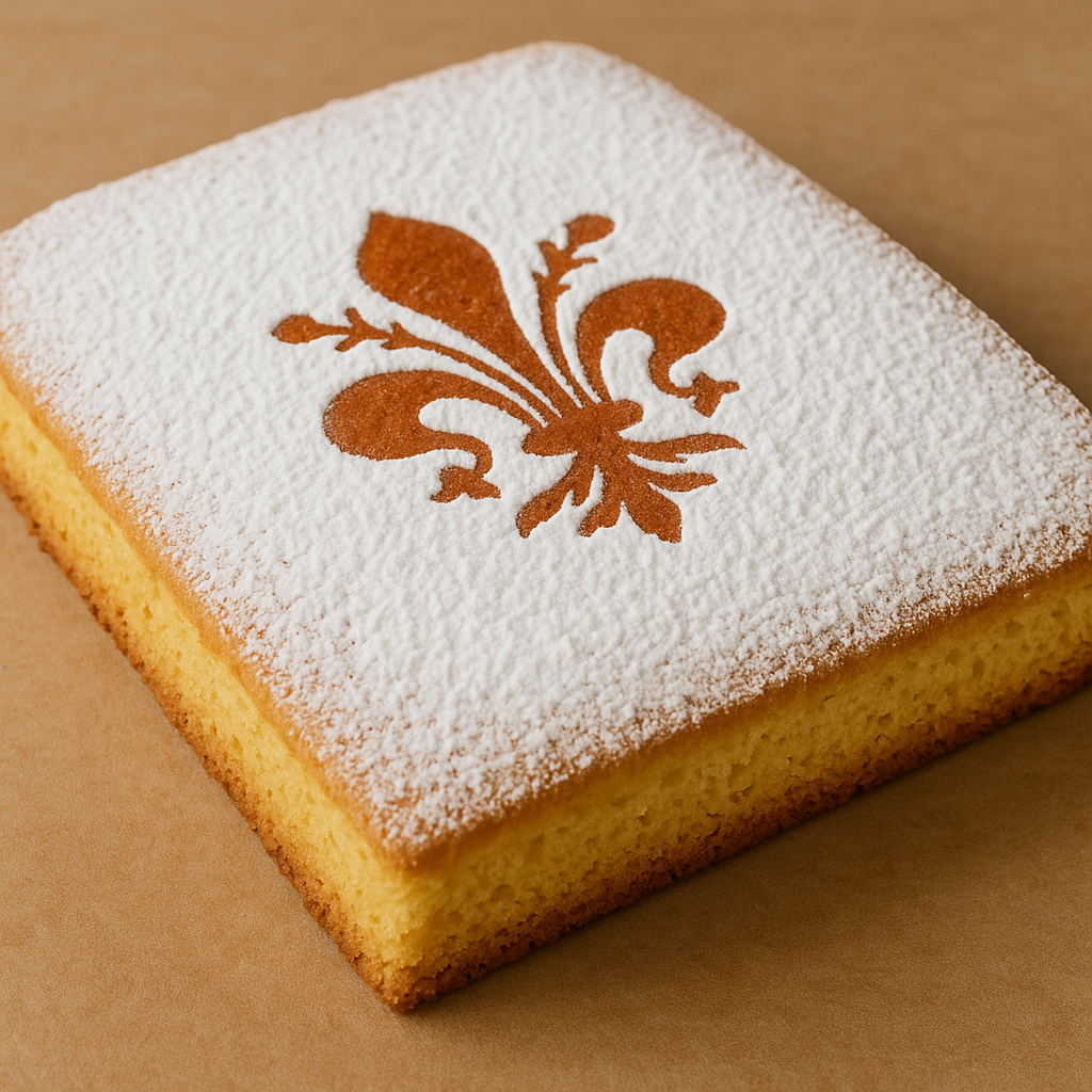 Si tratta di una torta bassa e morbida, preparata con un impasto semplice a base di uova, zucchero, farina, latte e scorza d’arancia, profumata e leggera. La superficie viene spolverata con abbondante zucchero a velo, talvolta decorata con il giglio rosso di Firenze.