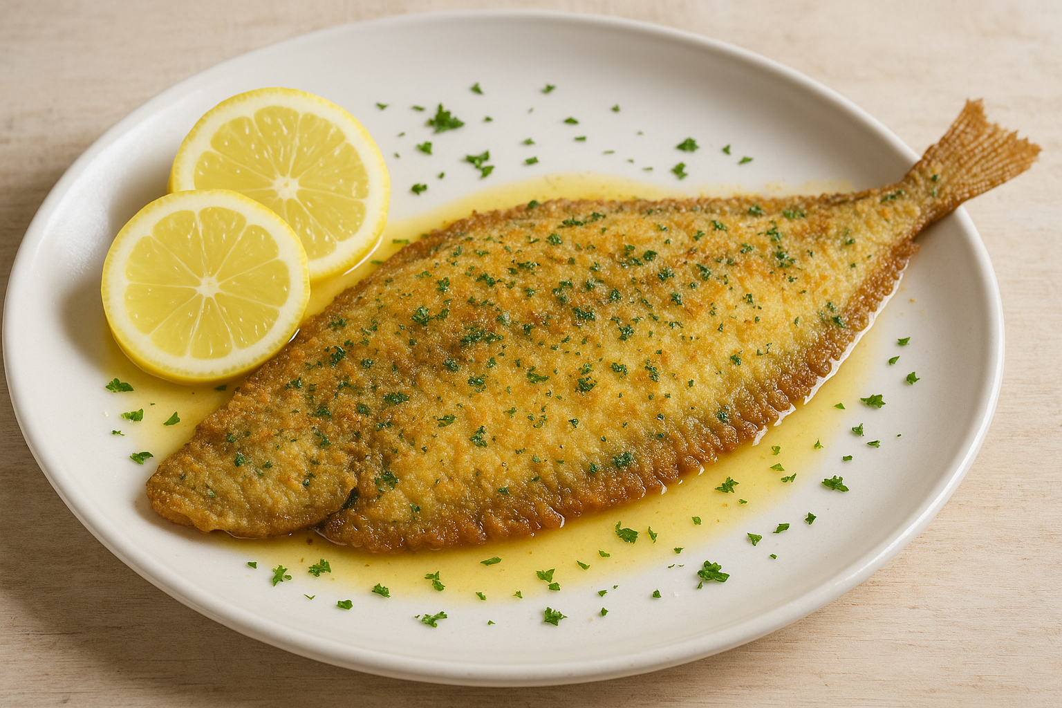 “Sogliole ben pulite, infarinate e passate in pane trito, cotte con poco olio e burro, con spruzzo di vino e succo di limone, da servire calde col loro intingolo.”