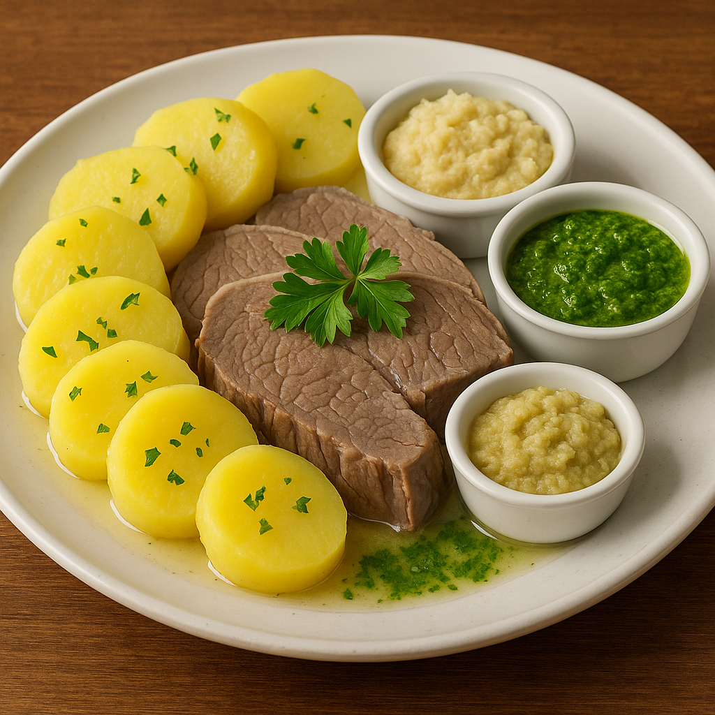 Il Tafelspitz è un piatto nobile della cucina austriaca, considerato un simbolo gastronomico di Vienna e molto apprezzato anche nelle zone di influenza austro-ungarica, come il Trentino-Alto Adige. Si tratta di carne di manzo (generalmente la punta di petto o il codone) cotta lentamente in brodo con verdure ed erbe aromatiche, fino a diventare tenera e profumata. La carne viene servita a fette, accompagnata da patate bollite, salsa di rafano (Apfelkren) e salsa verde a base di erbe. È una preparazione raffinata, semplice all’apparenza, ma ricca di sapore e tradizione.