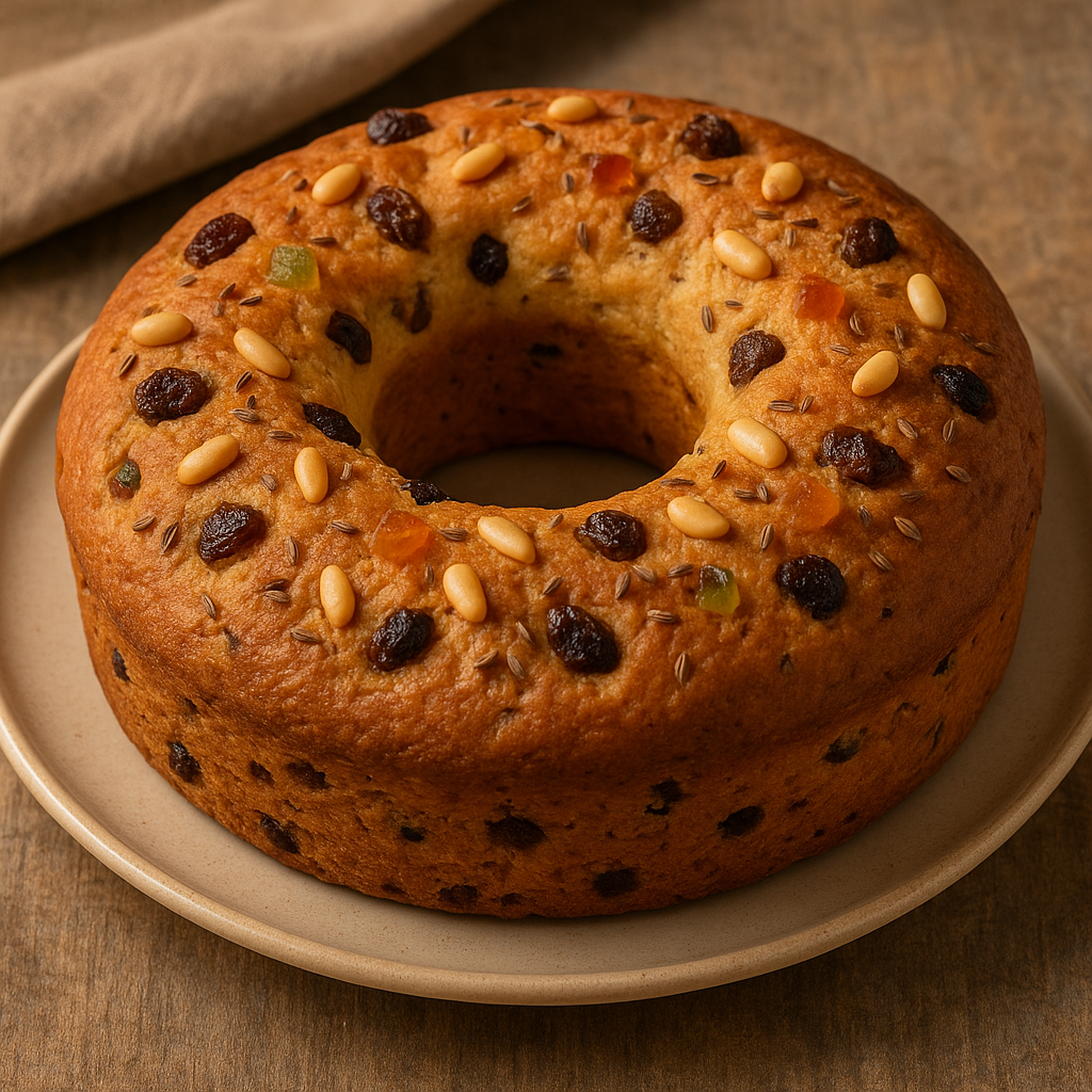 “Farina buona, un pugno d’anici, uva secca e pinoli; si fa la pasta con lievito e poco zucchero, si lascia crescere e si cuoce a ciambella nel forno caldo.”