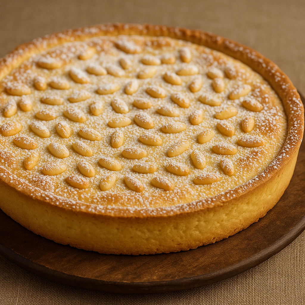“Si faccia frolla con burro, zucchero e uova, e vi si ponga crema di latte e rossi d’uovo odorata al limone. Si ricopra di pinoli e zucchero e si dia in forno, che ne venga dolce rustico e delicato.”